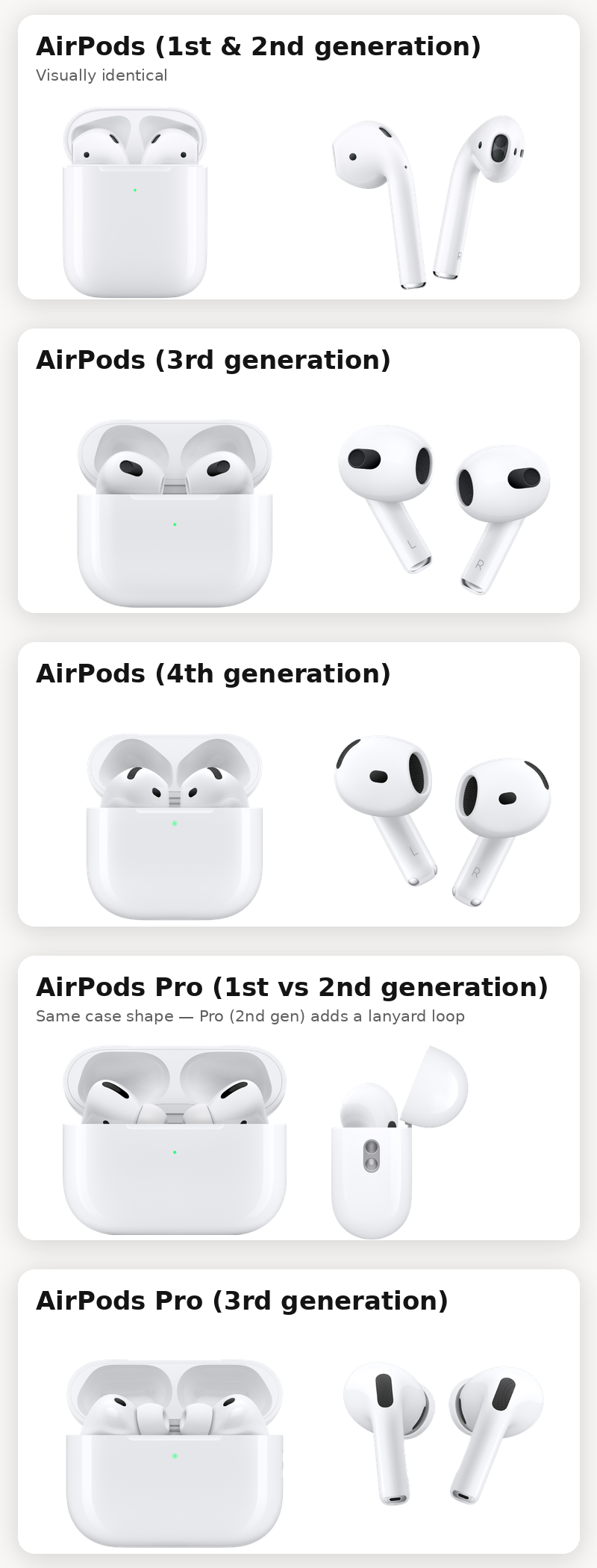 How do I know what generation my AirPods are? Check the model number inside your charging case lid or on the Settings menu of your connected iPhone under Bluetooth device info. You can also reference the purchase date and compare physical features like case shape and LED location.